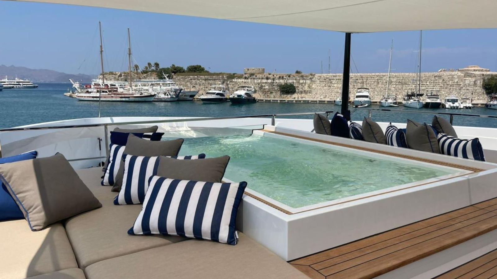 LEGASEA’s spacious aft decks invite guests to embrace the alfresco lifestyle, featuring a spectacular beach club with a plunge pool, extendable hydraulic wings, a rich toy collection, and a 14-meter new chase boat. A Jacuzzi, located on the foredeck, surrounded by sun pads for perfect relaxation